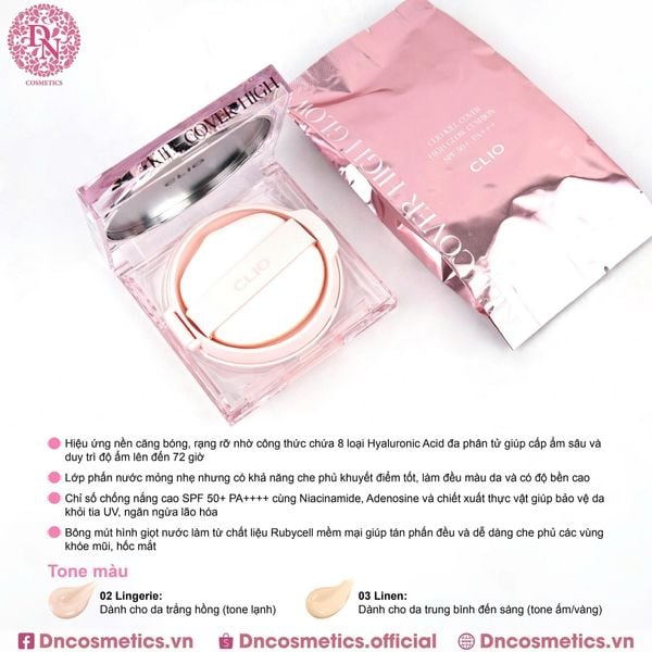 1.4. Phấn nước Clio Kill Cover High Glow (Vỏ lấp lánh): Độ dưỡng cao, bóng mượt rạng rỡ, lý tưởng cho da khô.