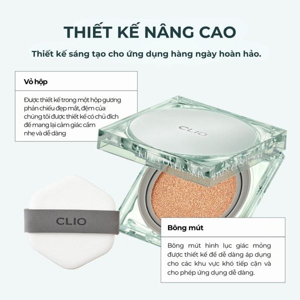 1.3.Phấn nước Clio Kill Cover Fixer Cushion (vỏ xanh ngọc): Cushion dành cho da dầu/hỗn hợp, nổi bật với khả năng che phủ lỗ chân lông và khuyết điểm tốt, tạo lớp nền lì (matte) bền màu đến 54 giờ và hạn chế lem trôi khi đeo khẩu trang.
