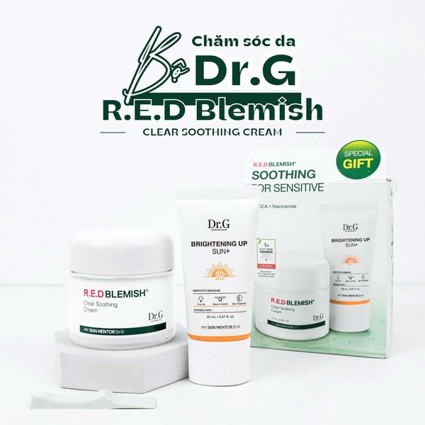 Bộ chăm sóc da Dr.G R.E.D Blemish Clear Soothing Cream Bonus Set bao gồm kem dưỡng làm dịu da và kem chống nắng, lý tưởng cho da dầu và nhạy cảm.