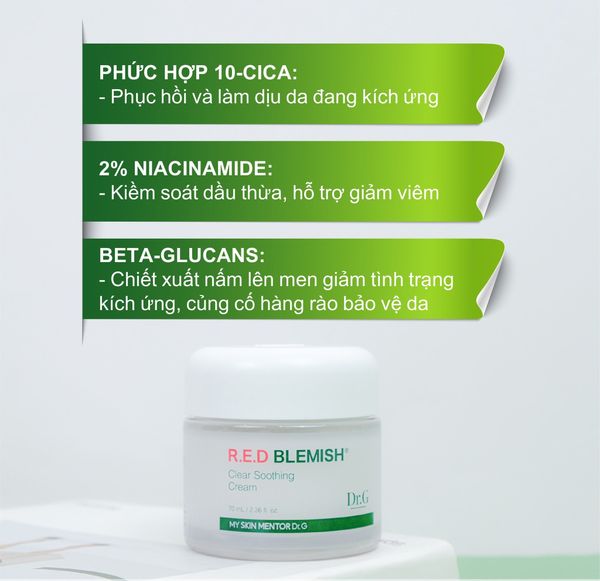 Kem dưỡng Dr.G R.E.D Blemish Clear Soothing Cream chứa các thành phần nổi bật giúp giải quyết các vấn đề về da nhạy cảm và mụn: