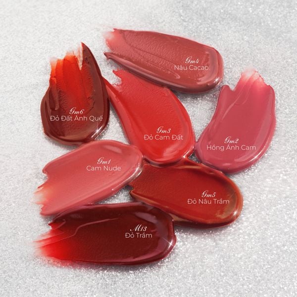 Bộ sưu tập Merzy The Glam Mellow Tint tập trung vào các gam màu trầm, đậm, thiên đỏ và nâu, phù hợp với nhiều phong cách trang điểm khác nhau. Bảng màu bao gồm: