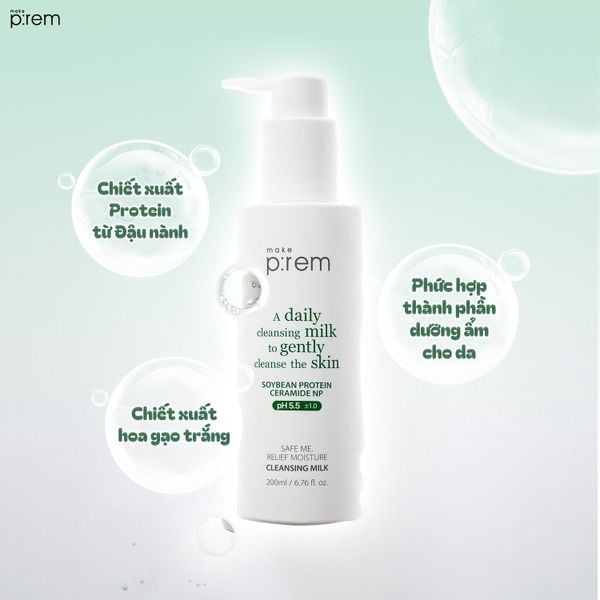 Sữa tẩy trang Make P:rem Safe Me Relief Moisture Cleansing Milk 200ml là sản phẩm tẩy trang làm sạch da đến từ thương hiệu Make P:rem của Hàn Quốc. Tẩy trang có kết cấu dạng sữa lỏng giúp làm sạch lớp tẩy trang, cặn bẩn và dầu thừa mà vẫn giữ lại cho da độ ẩm mịn sau khi sử dụng.